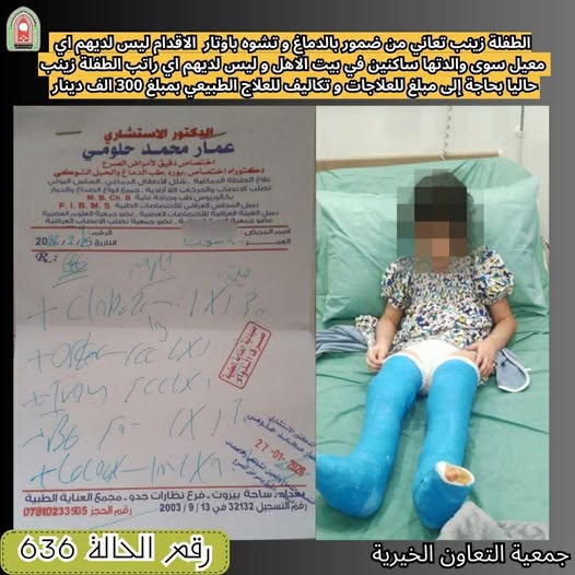 ما تحمل زوجي مرض بنتنا وتركها وتركني بس رحمة الله ضلت ماعندي بعد اكدر اعالجها هذه معاناة ام الطفلة زينب طلقها زوجها مباشرة بعد ماعرف زينب مريضة بضمور الدماغ وامراض اخرى اللي طلبه ام زينب مساعدتكم لها بمبلغ العلاج ومصاريفها الشهرية (300) الف دينار رقم الحالة 636 التبرع مفتوح من الف دينار وصاعدا