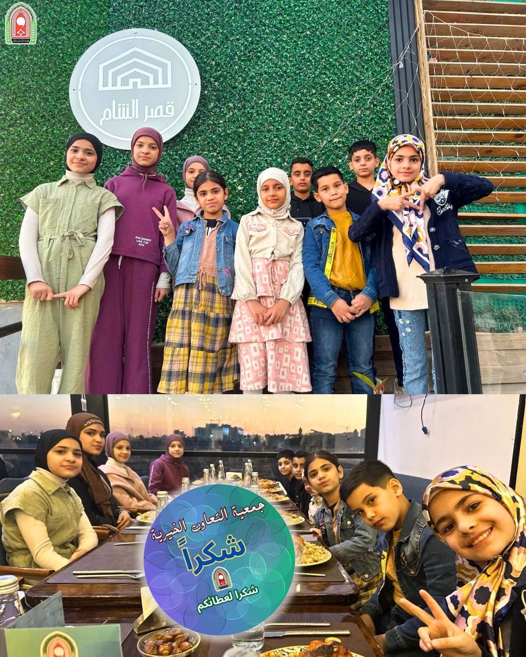 ضمن حملة فطورهم وياكم تتوجه جمعية التعاون الخيرية بالشكر والتقدير الى ادارة مطعم قصر الشام لاستضافتهم عشرة من تلاميذنا المحتضنين لدى الجمعية
