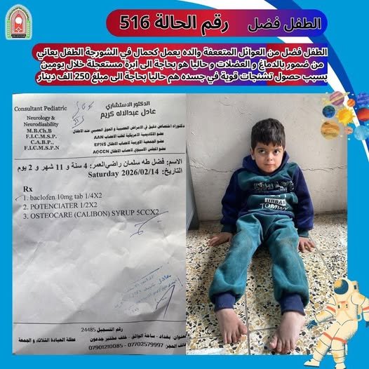 هذه كلمات الاخ ابو فضل ابنه بحاجة الى علاج يكلف 100.000 و شغل يد الدكتور 150.000