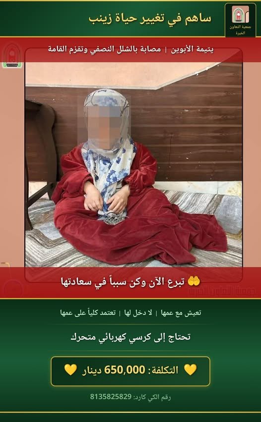 هذا بكل بساطة حلم زينب يتيمة الابوين تعاني من التقزم كل ما تتمناه كرسي كهربائي تكلفة الكرسي 650 الف دينار